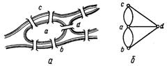 (рис. 7, а): можно ли совершить прогулку таким образом, чтобы выйдя из любого места города, вернуться в него, пройдя в точности один раз по каждому мосту? Ясно, что по условию задачи не имеет значения, как проходит путь по частям суши а, b, с, d, на которых расположен г. Кенигсберг (ныне Калининград), поэтому их можно представить вершинами. А так как связи между этими частями осуществляются только через семь мостов, то каждый из них изображается ребром, соединяющим соответствующие вершины. В результате