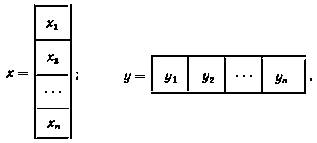 Столбцевую и строчную матрицы называют также векторами и сокращенно обозначают как x = (x1, x2, ..., xn) y = (y1, y1, ..., y1). Обычно из контекста ясно, идет ли речь о векторе-столбце или о векторе-строке. В противном случае используют приведенные выше обозначения.