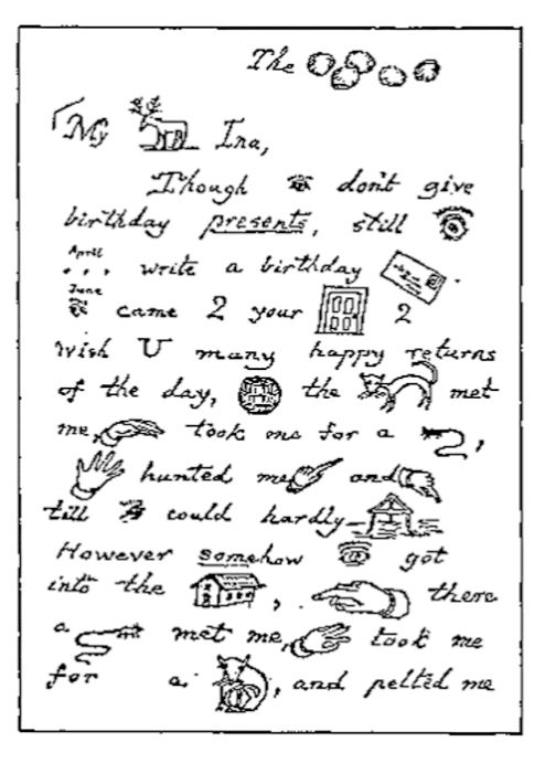 Ребусами увлекались многие знаменитости. Но, пожалуй, всех затмил великий и непревзойденный Льюис Кэрролл – в его обширнейшем эпистолярном наследии, насчитывающем около 100000 писем (!!!), ребусы рассыпаны в неимоверном количестве. Льюис Кэрролл очень любил подбрасывать своим юным (и необязательно юным) поклонникам рисованные загадки. Выглядело это, например, так ☞