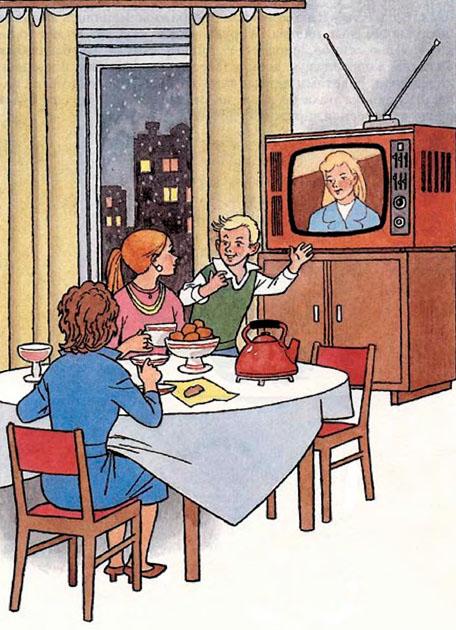 И вдруг Колюшка насторожился. На экране появился знакомый класс, знакомые приборы и треугольники на партах! Быстренько закивала зрителям «распорядительница». А у доски, по-доброму улыбаясь и что-то показывая Серёжке Бармалею, появилась в ярком голубом костюме знакомая фигура учительницы. Лицо её становилось всё больше, доброй улыбкой оно заняло весь экран – посмотрело на Колюшку, и Колюшка закричал: