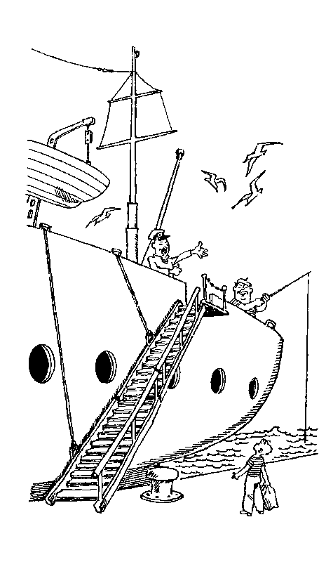 Солнышкин улыбнулся. «Смелей, Солнышкин!» – сказал он себе и направился к трапу. Но едва он сделал шаг вперед, как возле его уха что-то блеснуло и шлёпнулось в воду. Солнышкин вскинул глаза и увидел над бортом толстую, как у кота Базилио, голову и волосатые руки. Это был матрос парохода «Даёшь!» Петькин. Он нёс вахту у трапа и, чтобы не терять зря времени, ловил рыбу.