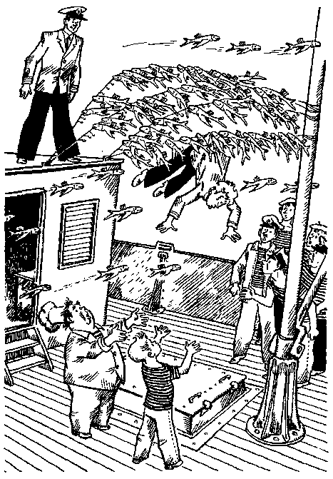 В этот момент разбуженный толчком Борщик открыл глаза и, слегка заикаясь, стал будить Солнышкина. Над кормой парили тысячи рыб, а среди них, на крючках, висел Пионерчиков. Штурман размахивал руками, будто дирижировал этим летучим ансамблем. У камбуза мгновенно собралась толпа. Борщик и Солнышкин бросились на помощь. Но Пионерчиков остановил их лёгким движением руки.