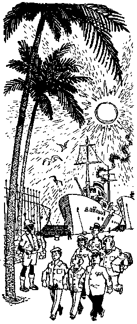 У ворот, под высокой королевской пальмой, задрав подбородок, стоял полицейский в коротких штанишках, и друзья прошествовали мимо него. Рядом с Перчиковым и Солнышкиным шёл Челкашкин, а за ним торопились Робинзон, Пионерчиков и Борщик с громадным свёртком под мышкой, в котором хранились самые вкусные бутерброды.
