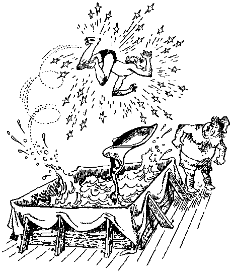 Верный, даже не обидевшись, с лаем бросился на него снова, но было поздно. Пионерчиков ласточкой прыгнул в бассейн. Вслед за этим раздался страшный треск, посыпались искры. Юный штурман, вылетев обратно, сделал в воздухе тройное сальто и плашмя шлёпнулся на палубу.