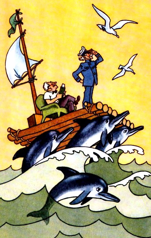 Старый заместитель был польщён. Он улыбнулся. Воины застучали копьями о щиты и разомкнули кольцо. Солнышкин сиял, Пионерчиков алел. И под шум океана дельфины вынесли бот прямо к борту «Даёшь!», откуда доносился лай: это лаял Верный, который всё время охранял островок Робинзона.