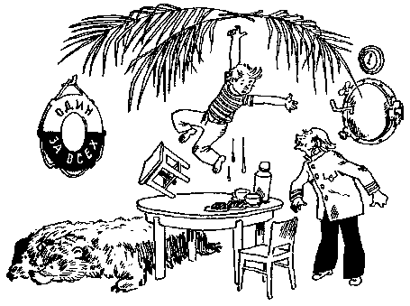 Солнышкин вскочил на стол, потом на подставленную табуретку, раздвинул листья и увидел в потолочной доске дырку, из которой выстрелил сучок. Солнышкин сунул в дырку указательный палец, но табуретка вылетела из-под его ног, и он повис в воздухе. Палец ныл, как зуб, в который доктор залез буром, но Солнышкин держался. Робинзон нашёл сучок, завернул в кусок старой тряпки и подставил Солнышкину табуретку. Солнышкин крепко вколотил сучок в дырку кулаком и спрыгнул.