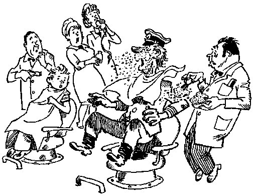 Все застыли в ожидании. Что же произойдёт? Маникюрша от растерянности вместо булки затолкнула в рот резиновую грушу от пульверизатора, а детский мастер по привычке, как ребёнку, протянула капитану для успокоения бутылочку из-под одеколона.