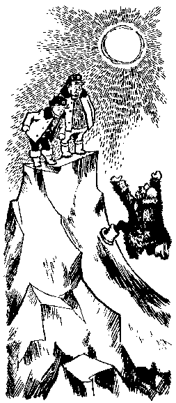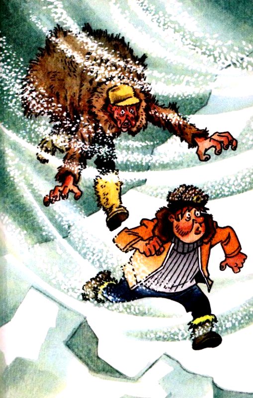 Солнышкин хотел было протянуть его артельщику, но передумал, опустил яйцо за пазуху, под свитер, и полез в гору. Снег всё злее впивался в лицо, голова звенела, как колокол, но Солнышкин поднимался вверх. Наконец он поднялся на верхушку горы, выставил вперёд ногу и… полетел в пропасть. Артельщик покатился за ним, а сзади, цепляясь за артельщика, делал сальто мистер Хапкинс.
