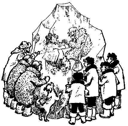 Солнышкин бежал вперёд, как лёгкий маленький паровозик. Пар отлетал от него вправо, потому что слева, с океана, дул сильный ветер. Но скоро «паровозик» стал странно подпрыгивать и отбивать ногами «летку-енку». Треща на морозе, перед ним вырастали глыбы льда. Они сверкали и переливались цветными огнями, будто доказывали, что им тоже можно дать любое имя и вовсе незачем идти далеко. Но Солнышкину были нужны настоящие вершины. Он, покрякивая, торопился вперёд и думал, какую вершину лучше штурмовать первой… Ту, что справа, он назовёт именем Перчикова, среднюю, конечно, именем Робинзона, а ту, что слева…