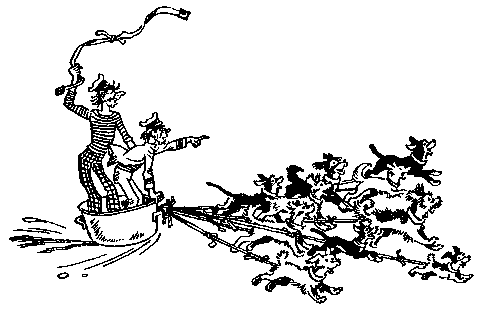 И через несколько минут вся – кроме Барьерчика – команда, поддерживая штаны, смотрела, как упряжка весёлых бобиков тащила к острову Ваську и капитана в компотном бачке, привязанном вместо нарт. Ездоки покрикивали: