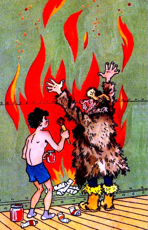 Увидев на рукаве красные отпечатки, он удивился: «Ты смотри, прижёг!» А услышав громкое «мяу», что-то вспомнил, вытащил из сапога чёрного кота и, улыбнувшись: «И тебя прижгло!», швырнул его в открытый иллюминатор.
