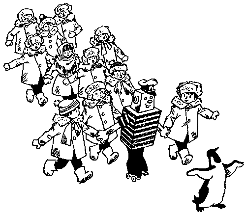 От острова Камбала тянулась возглавляемая Молодцовым такая весёлая стайка пингвинов, что спасённый Солнышкиным пингвиненок, то и дело смотревший за борт, скатился по трапу и, переваливаясь с боку на бок, заторопился навстречу родным братьям. Следом за дружком на лёд бросился Морячок. Пингвинята окружили его со всех сторон, и каждый старался подержать за руку!