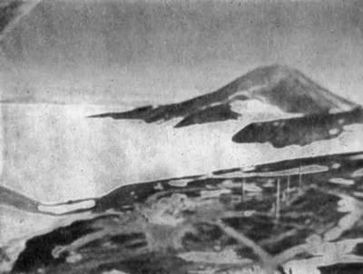 Углубившись приблизительно на 90 миль , «Оттер» продолжал лететь над хаотической областью ледяных утесов и громадного ледопада с такими большими трещинами, что он был совершенно непроходим. Спустя четверть часа впереди на мгновение показался сквозь горизонтальные слои облаков далекий зубчатый хребет снежных вершин. Затем по левому борту мы увидели два темных скалистых нунатака, а к северу показалась другая большая горная цепь с отдельными хребтами впереди. Мы думали, что эта цепь, должно быть, южное продолжение известных гор на севере Земли Королевы Мод. В 2 часа 17 минут дня самолет летел на высоте 6800 футов и быстро приближался к самому восточному хребту, который, по нашей оценке, имел в длину около 15 миль ; два больших ледника спускались с этих гор на запад. По-видимому, на поверхности обоих можно было бы найти дорогу к высоко расположенным льдам за ними. В 2 часа 30 минут дня мы набрали высоту 9600 футов и оценили высоту самого высокого скалистого пика в 9200 футов . Горы эти, по-видимому, сложены древними изверженными породами с внедренными в них диоритами, кое-где заметны пластовые интрузии и дайки. Общее направление цепи – с северо-востока на юго-запад, но дальше к югу скалы исчезали под ледяным покровом. К нашему удивлению, как раз когда мы собирались повернуть назад, к берегу, Джордж Лоу увидел двух качурок, летавших вокруг вершины пика в 7000 футов . Можно только предположить, что эти птицы гнездятся в горах в 230 милях от моря, где они нормально кормятся.