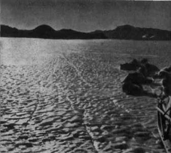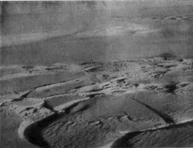 Отлетев на 15 миль , мы начали проходить над трещинами в шельфовом леднике; местами попадались пониженные участки, на которых видны были лужи воды. Некоторые из приподнятых краев льда были покрыты светло-желтыми пятнами, что, видимо, указывало на присутствие морских диатомей и, следовательно, на то, что вода, которую мы видели, вероятно, морская.