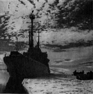 Вскоре мы увидели по правому борту как будто беспорядочную массу глыб изломанного льда, но он сливался с низким облаком, и трудно было определить, что это – только ли облако или массы льда, смешивающиеся с облаком. Льюис полагал, что это ледник Досона – Ламтона. Если это было верно, то «Оттер» находился в 60—70 милях к югу от Халли-Бей. Через 10 минут он уже летел над облаком, под которым, мы надеялись, окажется берег. Вдруг показался небольшой разрыв и через него стали видны два ледяных поля, плавающие на темной воде. Самолет пошел вниз, в этот разрыв, и оказался над ледяными утесами, изрезанными большими трещинами. По тому, что мы знали о береге с прошлого года, было ясно, что это может быть только кромка ледника Досона – Ламтона. Догадка Льюиса оказалась правильной, и нам нужно было только лететь на север вдоль берега к судну.
