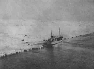 Когда судно стало уже видно, Рой Хомард зажег костер, приготовленный им наверху, на шельфовом леднике. Черный дым относило в сторону на фоне ослепительно блестевшего снега; все спустились к кромке льда, чтобы встретить судно. Повсюду кромка припая покрылась торосами от сжатия, вызванного проходящими мимо ледяными полями и айсбергами; местами торосы поднялись до 15 футов . Выбрав участок, за которым лед выглядел более гладким, капитан Петерсен начал выламывать небольшой «док» для своего судна. Вторая полоса сжатия оказалась неподатливой, но в конце концов на поверхность начали всплывать громадные куски льда; некоторые из них походили на небольшие айсберги мощностью до 30 футов . Этот процесс постепенного дробления льда продолжался несколько часов, пока судно не вошло в припай достаточно далеко, чтобы быть защищенным от всех ветров, кроме приходящего прямо с севера, но и в таком случае в «док» могли бы пройти к судну только небольшие льдины. «Док», конечно, получил название «Гавань Пита».
