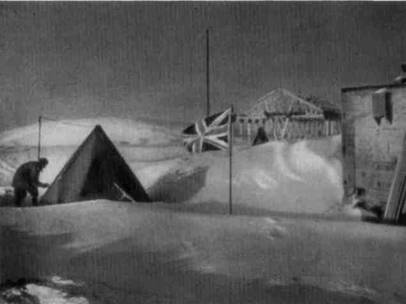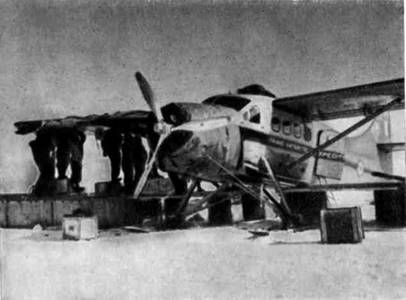 К тому времени, как самолет достиг залива Фазеля, облака разошлись, и, летя при ярком солнце на высоте 2000 футов , мы могли видеть Шеклтон, до которого еще оставалось 20 миль . Делая круг над базой, мы увидели, что для нас отметили флагами посадочную полосу. Еще минута, и после двух с половиной часов в воздухе «Оттер» сел и подрулил к маленькой группе ожидающих фигур. Все кругом пожимали нам руки. Мы выгрузили почту за весь год, картофель, апельсины, яблоки, уголь и многое другое, привезенное для базы. Затем все отправились в домик, где рекогносцировочная партия провела остаток дня в чтении писем и обмене с нами шеклтонскими новостями и новостями внешнего мира.