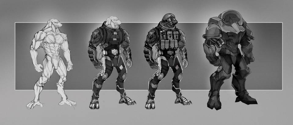 Рядовые бойцы встречались в обычных скафандрах («ящерицам», как и людям, далеко не все планеты годились для жизни, и хоть атмосфера, к примеру, Земли для них не подходила, какое-то время выживать даже без скафа они могли). Чуть позже появились модификации – «ящерицы» не чурались красть у людей все наработки, технику, инженерные решения.