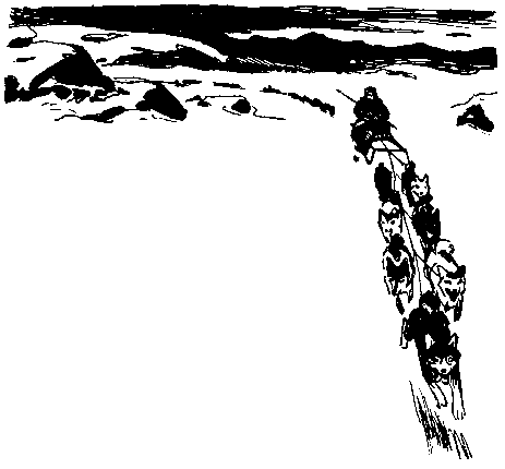 На следующее утро с восходом солнца караван из восьми нарт, запряженных восемью-десятью собаками, покинул материк и, обогнув скалы оконечности Святого Носа, потянулся через море на север. По ровным участкам, хотя и изборожденным застругами, собаки тянули быстро, так что люди на лыжах едва поспевали за ними. Но там, где путь преграждался грядой торосов, движение очень замедлялось, так как, выбрав более низкое место для прохода нарт, приходилось каждую из них протаскивать отдельно, причем люди помогали собакам, одни подталкивая нарту сзади, другие направляя ее сбоку и поддерживая при помощи лыжных палок. Если среди глыб торосов не было удобного проезда, людям приходилось работать топорами, которые у всех были за поясом. Под ударами топоров лед, охлажденный зимними морозами до 30-40 градусов ниже нуля, разлетался на осколки со звоном, словно стекло. Во время этой работы собаки всех нарт, пользуясь остановкой, словно по команде, ложились отдыхать на снег, прекрасно зная, что стук топоров предвещает им четверть часа особенно трудной тяги.