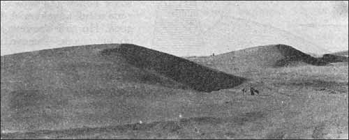 Рис. 40. Цепь высоких барханов возле г. Диньбянь на южной окраине Ордоса. У подножья для масштаба мул и осел