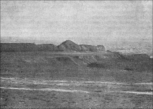 Рис. 43. Остатки Великой стены, на заднем плане пояс сыпучих песков Южного Ордоса