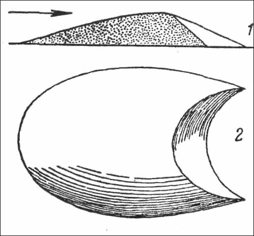 Рис. 45. Типичный бархан: 1 – продольный разрез; 2 – вид сверху
