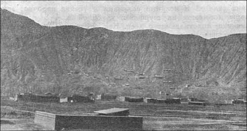 Мы переночевали в маленьком поселке среди пустыни, существующем очевидно только на счет проезжих по этой дороге, ведущей в г. Фумафу, столицу Алашанского князя; возле поселка полей не было. На следующий день продолжали путь и вскоре поднялись на холмы предгорий к устью ущелья; здесь, несмотря на каменистую почву, усыпанную валунами, много площадок было расчищено под пашни, обсаженные деревьями, а в устье ущелья оказалось и селение, отвоевавшее у пустыни свои поля благодаря возможности орошения их водой небольшой речки, текущей с гор. Валуны пашен были тщательно сложены в стенки, ограждающие участки полей. Подобные же маленькие селения китайцев видны были и в устьях соседних ущелий.