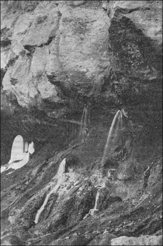 Рис. 49. Источники, вытекающие изпод красных конгломератов в нижней части обрыва хр. Гуаньшань против г. Ланьчжоу