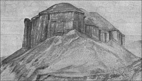 Рис. 50. Холм красных песчаников, покрытых лёссом, напоминающий древний замок, в горах к северу от г. Ланьчжоу