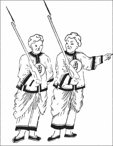 В довершение картины нас обогнал в этой долине отряд китайских солдат, который двигался под звуки барабанов и дудок в облаке пыли словно на штурм этой крепости. Солдаты шли не в строю, а толпой, вразброд; они были одеты в черные или синие куртки, такие же панталоны и обуты в обычные башмаки из ткани с толстой подошвой; на спине и груди каждого были нашиты крупные иероглифы, черные или красные на белом или желтом фоне (рис. 51). Головной убор одних состоял из платка или повязки вроде тюрбана, у других из черной ермолки обычного типа, у третьих из шляпы, похожей на кокошник. Оружие было разнообразное – у одних пики, у других ружья разных образцов, у третьих даже лук и стрелы в колчане. Офицер ехал верхом на некотором расстоянии позади, очевидно, спасаясь от пыли, которую поднимал его отряд.