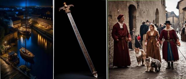 А ночью, я включив мимикрию, отправился за очередным мечом, ибо он находился в подвалах дворца. Мой виртуальный экран начертил точный маршрут, включающий входы в потайные тоннели и ходы, которыми этот замок просто кишел. Кицуне пришлось взять с собой, уж больно она настаивала на этом. Войдя, в потайной ход и углубившись вниз по целой системе проходов со ступеньками мы вышли в большой тоннель, высотой с пару человеческих Ростов с теряющимися вдалеке направлениями. Я включил нам с Заславой систему ночного видения и тоннель как бы ожил… тут происходил некий призрачный карнавал. Смутные образы людей в карнавальных костюмах водил хороводы в непонятных танцах. Но внезапно Кицуне тихо взвизгнула и выхватив палаш протянула его в ту сторону, где призрачные силуэты раздались в стороны и застыли и там мы увидели три странных белых фигуры четко выделяющиеся на призрачном фоне. Девочка с распущенными волосами, стоящая к нам спиной, белый котенок прижавшийся к полу и высоченный призрак кота, который к нам и обратился со следующими словами… ' Привет тебе пришелец из неведомого. Ты вернешь нам покой, убрав Черный талисман', и махнул лапой в сторону стены, где высветился квадрат в кладке и именно туда указывал курсор на моем виртуальном экране. На стене уже привычно вспыхнул мерцающий зелёный силуэт пятерни, куда я возложил десницу, что и сработало ключом. Кладка осыпалась и пред нами предстала каморка в центре которой висел черный мерцающий меч, а в углу пребывала мумия девочки, прижимавшей к себе котенка. Я взял меч за эфес и даже сквозь перчатку почувствовал холод и подсознательно понимая, что счет идёт на секунды, подбросил мячик и рубанул по нему нчом, который становился, все холоднее и тяжелее. Мячик со звоном отлетел в угол где были мумии и они беззвучно рассыпались в прах, а меч вспыхнув облаком снежинок, на прощание подморозив мне пальцы, тоже исчез. А в голове у меня прозвучал хор шелестящих голосов пропавший: «Спасибо тебе за покой пришелец из неведомого».