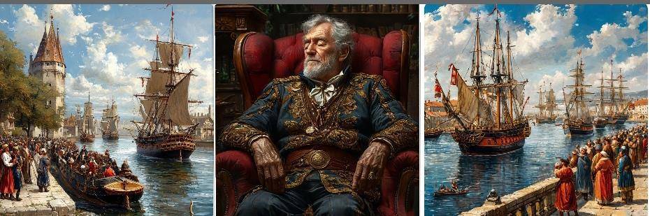 А тем временем Док, с Щукой и парой Речных крейсеров в брюхе и в сопровождении трех рейдеров из старого состава выдвинулся к Кадису и по пути к ним присоединилась Ирландская эскадра, где ирландских судов было аж три штуки, а остальные девять были из Грумантских трофеев и имели Ирландские каперские патенты и экипажи из поморов и ушкуйников*, ну и плюс семь английских судов и все это под командованием адмирала Айвена (каперанга Иванова). Док шел отдельно и выпустив Щуку и крейсера ушел мористее, где скомпилировав из грузовых стрел мачты, притворился огромным Черным фрегатом.