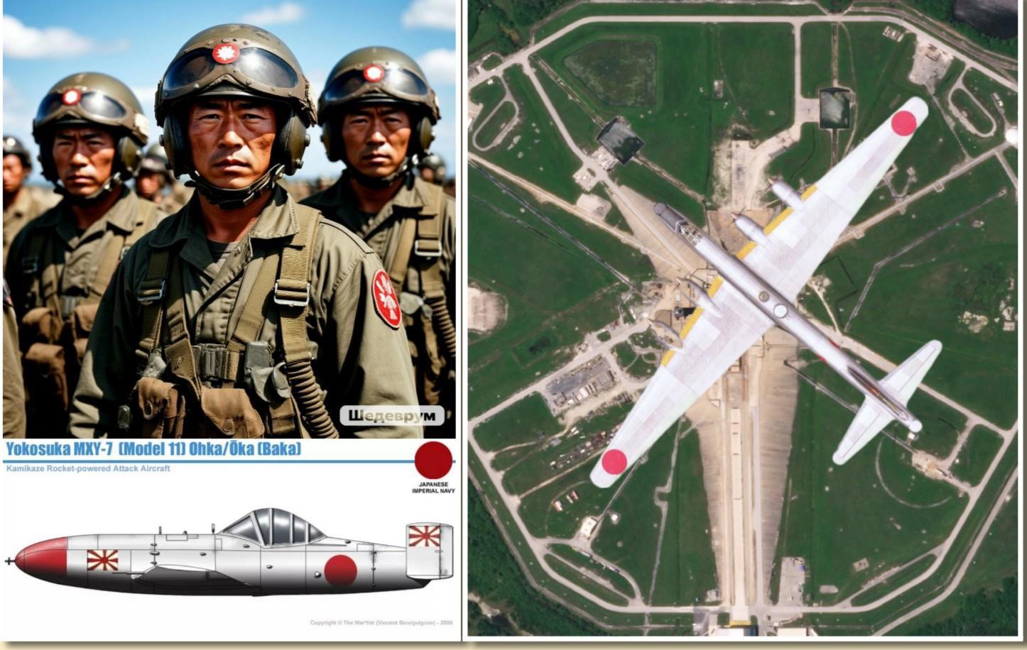 Третий самурай, продолжая тему: самолёт на самом деле сделан заново, только некоторые фрагменты старого фюзеляжа оставленны для правдоподобности. Двигатели поставлены современные, более мощные. Изначально на самолёт подвешены муляжи бомб "Ока"* и мерзкие гайджины повадились ходить к самолёту и хихикать называя бомбы "Бака"*. Ночью накануне боевого вылета, они будут заменены на четыре настоящих, с мощными современными боеголовками. Самолёт и бомбы покрашены секретным составом из лабораторий " Мицубиси ", который на пять-шесть часов делает самолёт и бомбы невидимыми для радаров. Тогда же будут вставлены затворы в бортовые пушки и пулеметы.