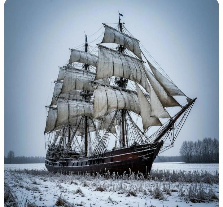 Равнина с замерзшими кораблями почти не изменилась. Так же две фигуры виднелись на носу гигантского корабля, но к ледяному пантеону присоединился большой парусник застывший в снежном поле с поднятыми парусами.