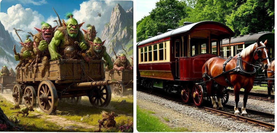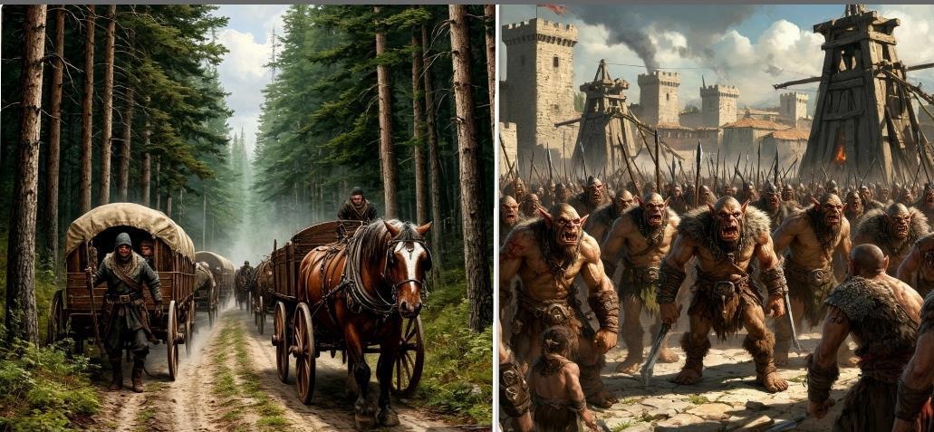 Я думал о том, как попасть в осажденный город, когда состав остановился в долине, (для подпряжки дополнительных битюгов перед подъемом), как вдруг со склона поросшего лесом холма, в нашу сторону покатились какие-то дикие телеги набитые орущими лесными троллями, что меня поразило, так это то, что телеги были без лошадей. Я честно говоря даже немного обалдел от такого тактического решения, по гениальности напоминавшего махновские тачанки, пустить телеги в атаку накатом под горку, это было нечто. Но раздумывать было некогда... Я вылез на крышу вагона, извлёк из хранилища Орлика, который моментально превратил свои копыта в широкие присоски наглухо присосавшиеся к крыше и дав верному "Стальному кентавру" целеуказание и достав свой верный карабин, я скомандовал нам с Орликом – "Огонь".