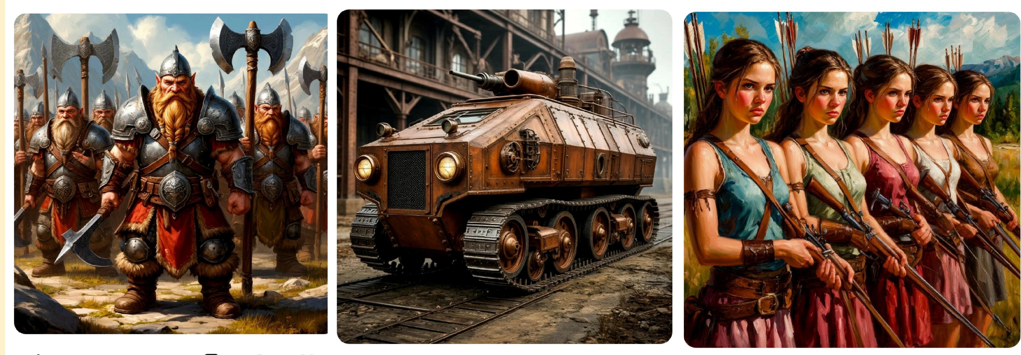 Экипажи для боевых машин я заложил смешанные... Тоесть там были и люди и гномы. Гномы были водителями и техниками, ну и естественно канонирами. А люди арбалетчиками. То есть тяжёлый транспортный бронеход, мог быть или обозной единицей, или же арбалетной передвижной батареей.