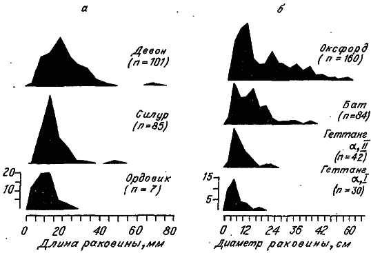 Рис. 17.Изменение видовых распределений брахиопод (а)и аммонитин (б) по размеру раковины в историческом развитии (по: [Stanley, 1973]).
