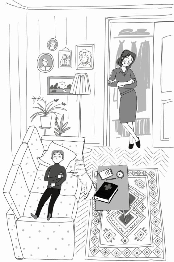 Мама пришла в комнату, увидела меня лежащим и страдающим на диване.
