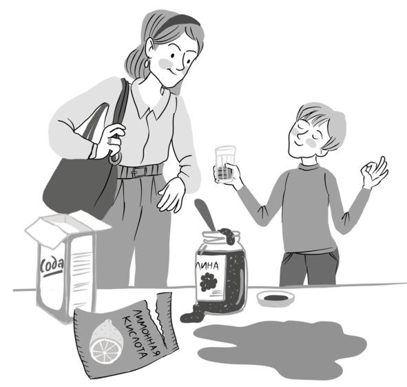 Дома открываю кухонный шкафчик. Так… От чего мне становится лучше? Лимонная кислота, варенье, томатная паста… Нет, томатная паста не годится, надо начинать с варенья. Стакан, вода из чайника, варенье, лимонная кислота… Нет, не то. Слишком кисло. Ага, забыл про соду! Если смешать соду с кислотой, то получается шипучка. Совсем не такая, как газировка из магазина. От моей шипучки щиплет в носу и текут слёзы. Добавляю соду, из стакана на стол выливается розовая пена. На кухню входит мама.