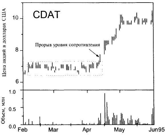6.1. Прорыв уровня сопротивления. Итак, произошел прорыв верхнего предела колебаний – уровня сопротивления. Цена акций резко пошла наверх, объем торговли вырос. Компьютеры многих трейдеров зарегистрировали этот прорыв, и акции стали предметом всеобщего интереса. Что делать?