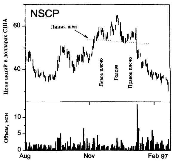 Рис. 9.5. Графическая фигура «голова-плечи», завершающая рост акций. Пересечение правой границы правого плеча с линией «шеи» является точкой продажи акций и начала игры на понижение (компания Netscape Communication)
