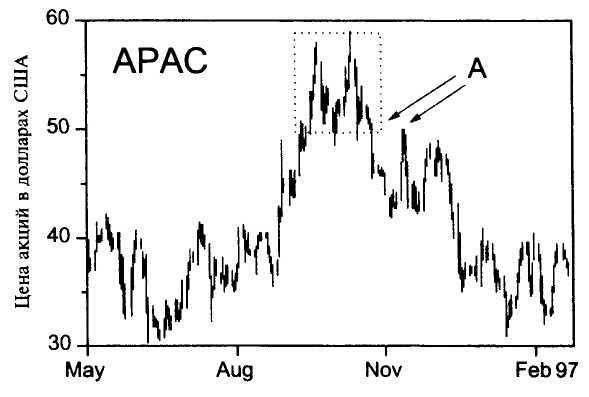 Рис. 9.6. Графическая фигура «двойная вершина», завершающая рост акций (компания АРАС Teleservices, Inc.)