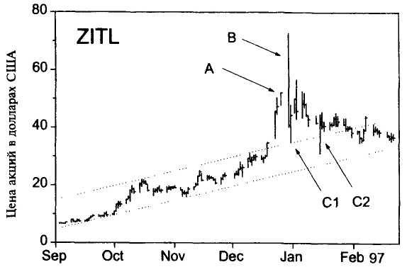 Рис. 9.7. Пример бурного роста акций, при котором их цена резко выходит из канала (компания Zitel). Точка А удачна для начала игры на понижение, точка В – для усиления позиций; закрывать позицию при кратковременном трейдинге можно в точках С1 и С2