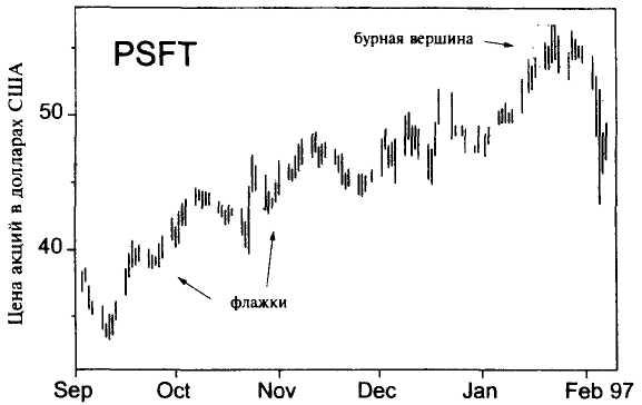 Рис. 9.8. Пример «бурной вершины» и «флажков» (компания Peoplesoft, Inc.). Сильное колебание акций без их роста часто является предвестником начала существенного падения цены