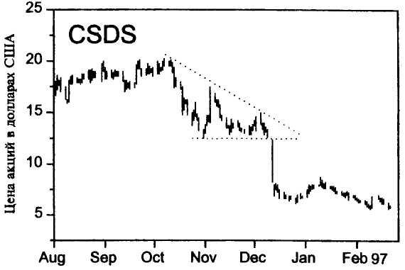 Рис. 8.8. Пример «треугольника» (компания Casino Data Systems). Последовательное уменьшение высоты подъема цены акций часто предшествует их сильному падению