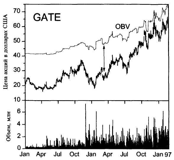 Такова главная идея индикатора OBV. Если рос цены акции сопровождается возрастанием OBV, то такая тенденция роста считается устойчивой: энтузиазм и число оптимистов увеличиваются, а значит у акций есть потенциал дальнейшего роста. Однако если очередной максимум цены акций оказался выше предыдущего, а текущий максимум индикатора OBV не превышает предыдущего, то это опасный знак: пессимизм, который стал развиваться по отношению к данным акциям, может вызвать их скорое падение. И наоборот – если акции не растут, но растет их индикатор OBV, то это знак неплохих шансов данных акций. Рисунок 9.10 иллюстрирует одно из применений индикатора OBV.