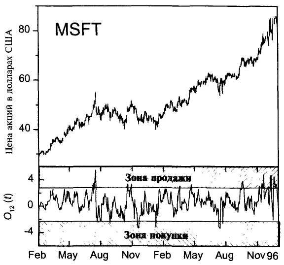 Существует и другой подход к выбору момента покупки или продажи акций с использованием осцилляторов. Считается разумным покупать акции, когда на графике осциллятора они начали переходить из отрицательной области в положительную. Продавать же акции надо в точках, где осциллятор меняет знак с положительного на отрицательный. Такие переходы считаются более надежными критериями, так как тенденция «снизу вверх» (или «сверху вниз») уже определилась, а тенденция имеет свойство сохраняться некоторое время. Этот метод хорошо работает в случае растущих акций. Играя на месячных колебаниях цен, можно, например, использовать 50-дневные динамические средние. Существует множество примеров, когда таким образом были получены весьма значительные прибыли. Однако гораздо большую прибыль можно получить, если не дожидаться точки пересечения с нулем, а продавать или покупать акции сразу, как только тенденция изменения осциллятора сменила знак и стала устойчивой.