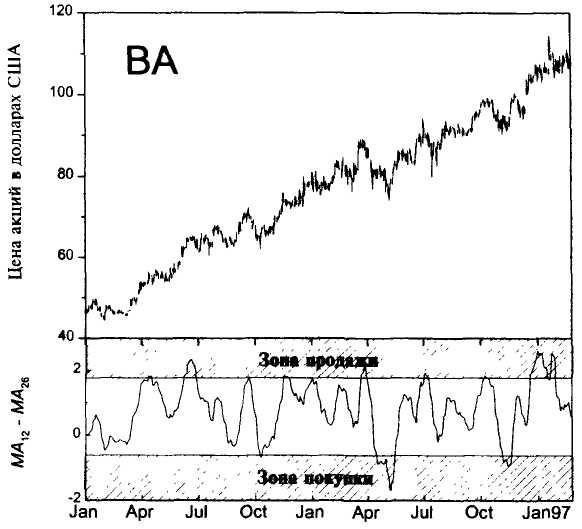 Рис. 9.12. Осциллятор, вычисленный как разность динамических средних за 12 и 26 дней (компания Boeing)