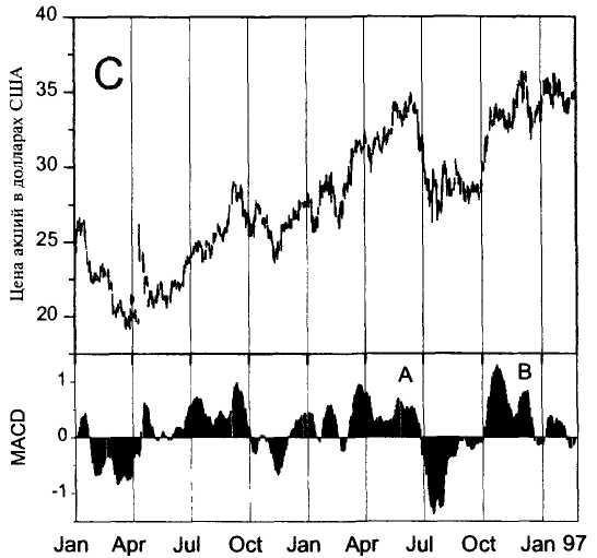 Рис. 9.13. MACD-гистограмма. Точки А и В – наилучшие моменты продажи акций и начала игры на понижение (компания Chrysler)