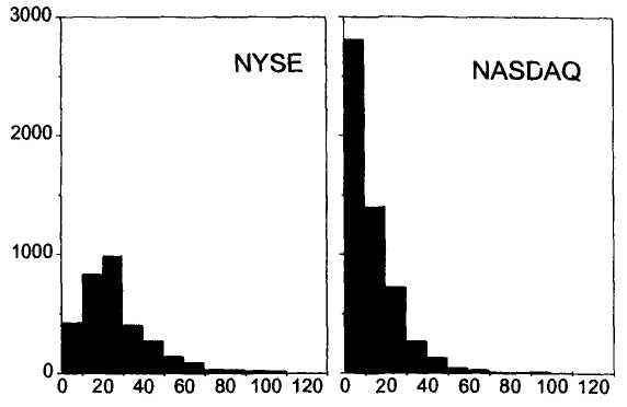 Рис. 6.2. Распределение цен акций на нью-йоркской бирже NYSE и на рынке акций NASDAQ